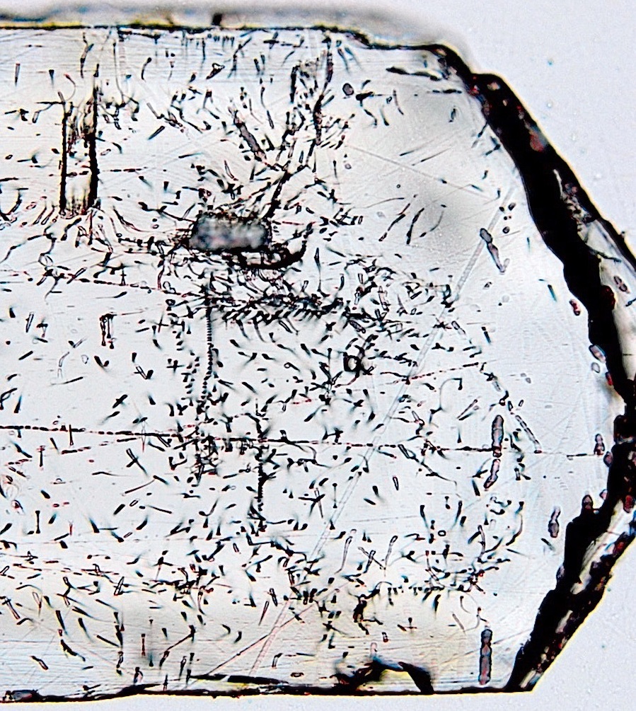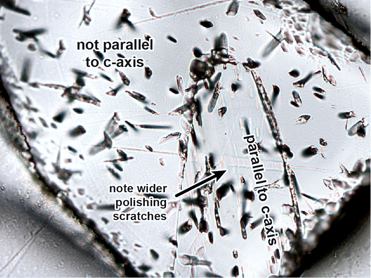 Apatite showing core with etch pits parallel to the crystallographic c-axis, and a second region with irregularly alighted etch pits signifying this part of the polished surface is not parallel to the c-axis. Note the wider polishing scratches in the section parallel to the c-axis. These wider, well-defined scratches can often be used to identify grains with polished surfaces parallel to the c-axis in the absence of fission tracks.