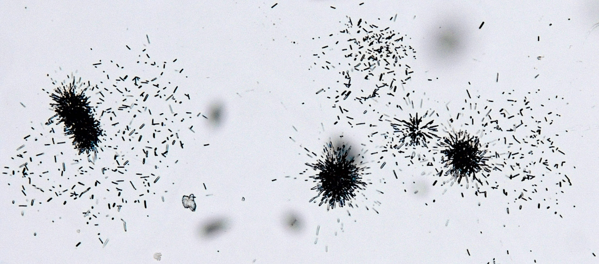 Induced fission tracks in an external mica detector. In this case the clouds of tracks highlight apatite fission track grains, but with several "star clusters" of high track density that represent induced tracks from small high uranium inclusion with the original apatite grain. Unsurprisingly, this sample yielded apatite (U-Th)/He ages that were very dispersed, and most significantly older than the intrusion age of the granite from which these apatite grains were obtained. Many of these inclusions were very small, and not easily identified during selection of grains for (U-Th)/He dating.