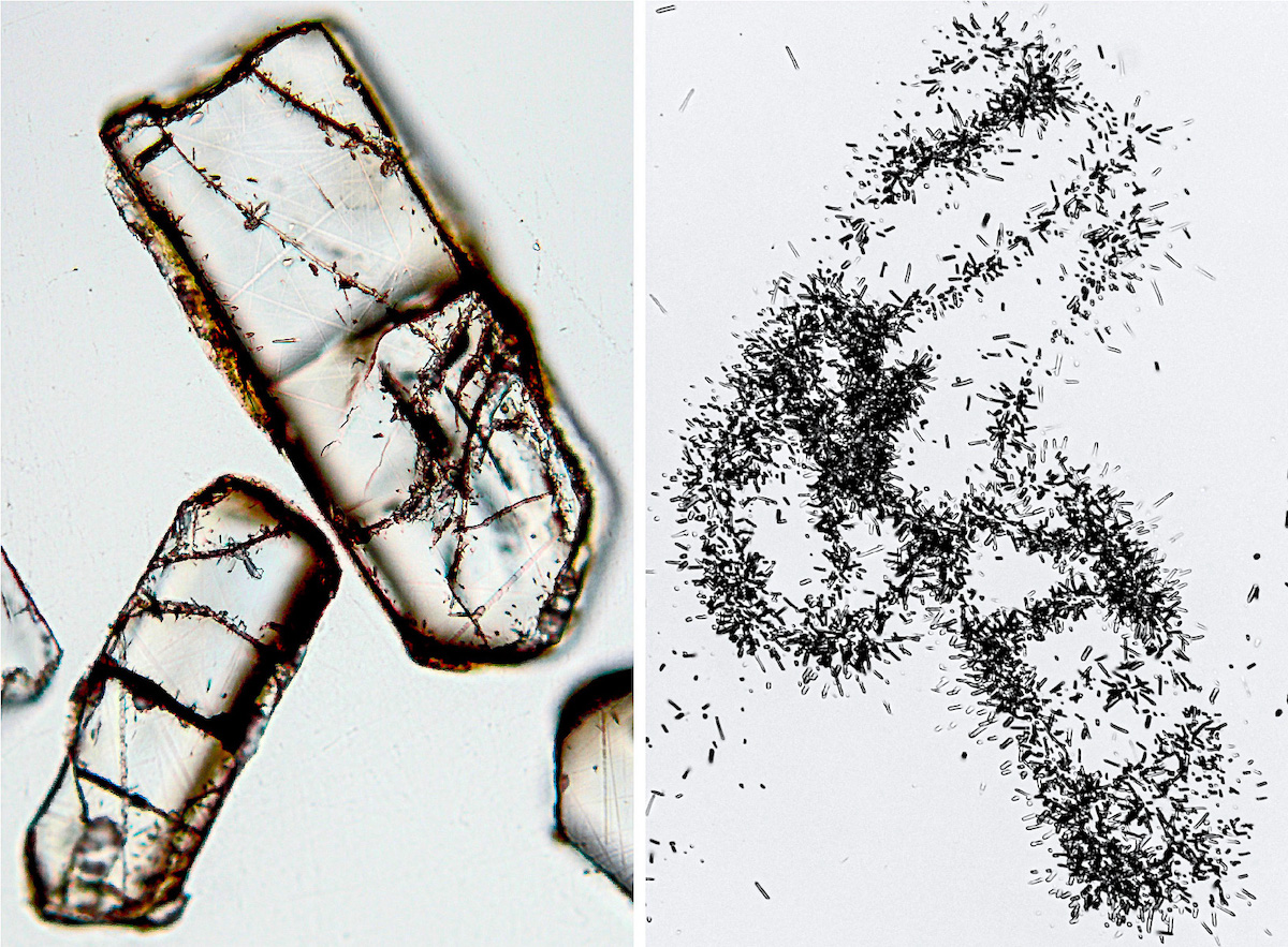 Left image shows apatite grains with cracks displaying very localized high fission track densities, and thus signifying locally very high uranium concentrations. The orange-brown coloration of these cracks suggests the high uranium may be associated with iron-rich "grunge". Image on right shows etched induced fission tracks from the external detector mica after sample thermal neutron irradiation, confirming the locally very high uranium concentrations focused along the cracks.