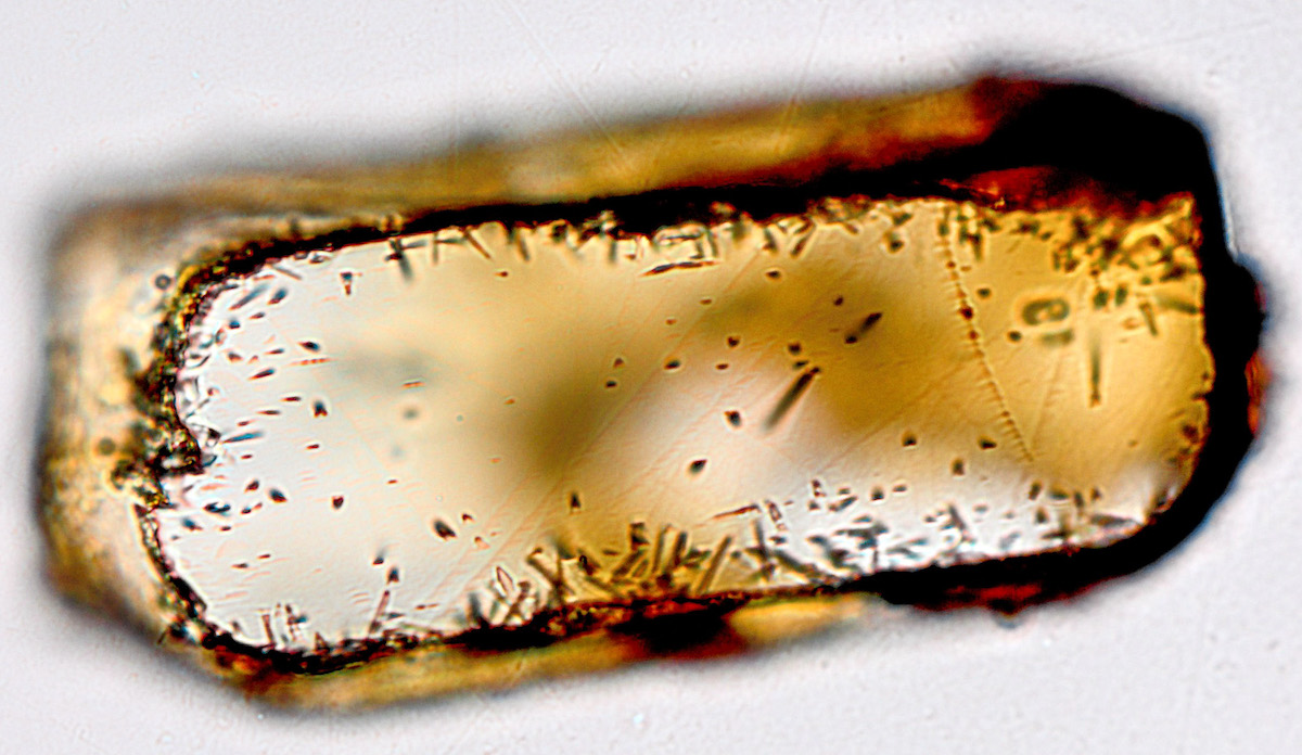 Another apatite grain showing orange-brown, likely iron-rich, coating. In this case the grain is also notable for showing fission tracks that appear to originate from this rim, suggesting this rim-coating has high uranium concentration. Such high uranium coatings will also likely lead to significant helium implantation into the grain produced during uranium decay to lead. Thus any (U-Th)/He age obtained from such a grain is likely to significantly overestimate its true (U-Th)/He cooling age. Indeed this sample, from a granite near the Beardmore Glacier in the Transantarctic Mountains, did produce very dispersed apatite (U-Th)/He ages, as we highlighted in the manuscript He et al., 2021, Earth and Planetary Science Letters, v. 567 - check the supplementary information.