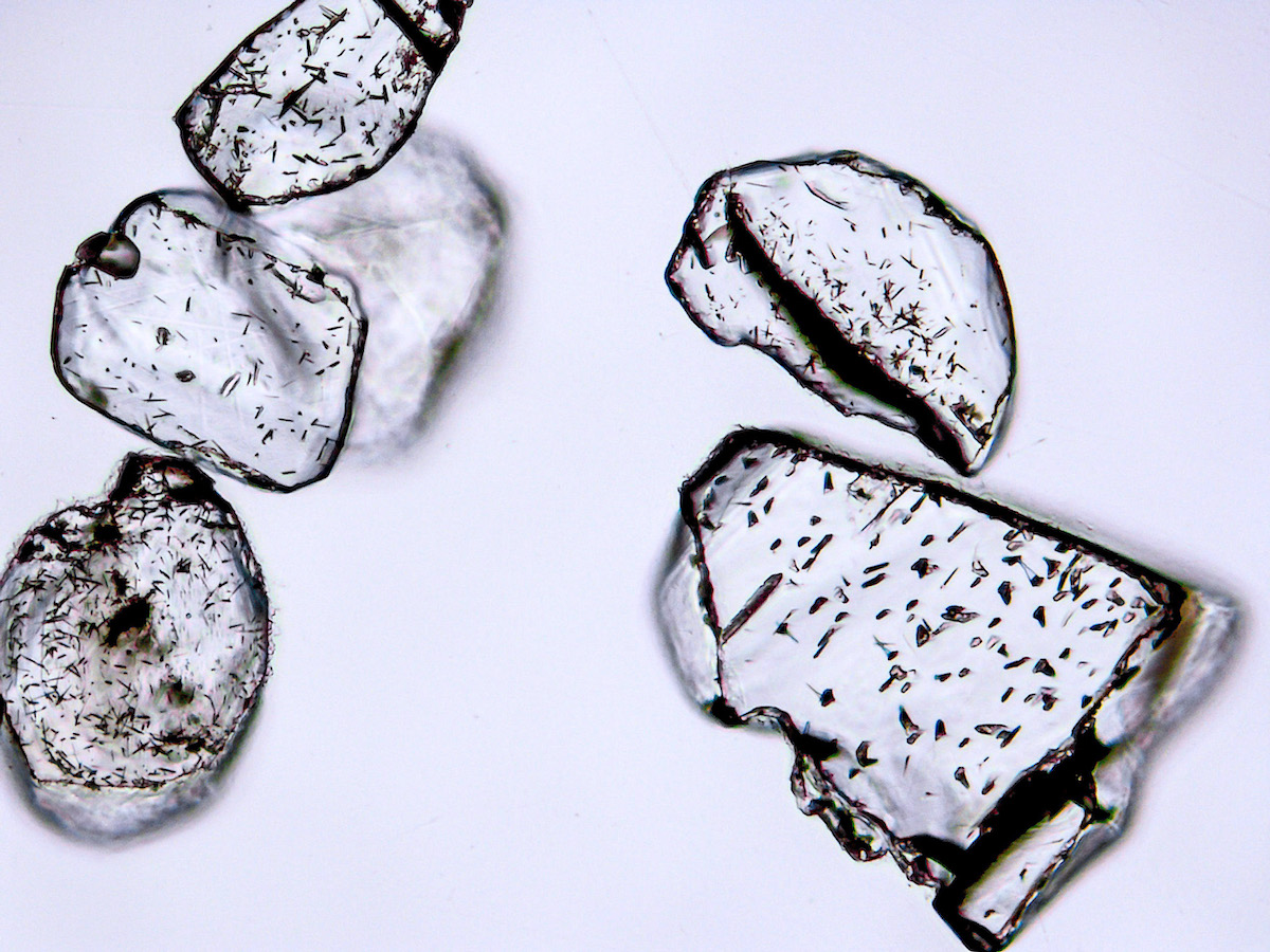 Etched detrital apatite grains showing highly variable fission track widths (or diameters). This will be reflected in the measured "Dpar" values (Dpar = the diameter of the etch pit parallel to the c-axis, where the fission track intersects the polished grain surface). The grain on the lower right has particularly large fission tracks. Given the generally positive correlation between etched fission track width and higher chlorine content, this likely reflects a grain high in chlorine (relative to fluorine and hydroxyl (OH) in the F ,Cl, OH anion site), although other substitutions for calcium within the apatite crystal structure such as manganese, strontium, or light rare earth elements may also lead to larger etched fission track widths.